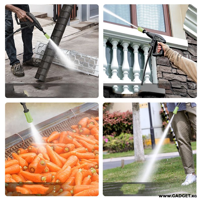 - Продуманная конструкция — кронштейны для шнура питания и шланга высокого давления, а также держатель для пистолета обеспечивают удобство хранения.