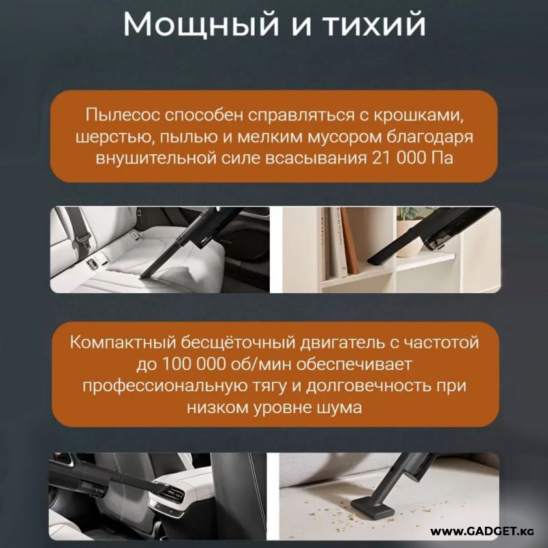 Пылесос оснащен высокоэффективным бесщеточным двигателем, обеспечивающим мощность всасывания в 21 000 Па. Он эффективно справляется с широким спектром загрязнений, включая мелкодисперсную пыль, пищевые крошки и шерсть домашних животных. Высокопроизводительный двигатель, достигающий частоты вращения до 100 000 об/мин, гарантирует стабильную мощность и высокую эффективность вакуумной уборки.Благодаря этому уборка становится легкой и комфортной.