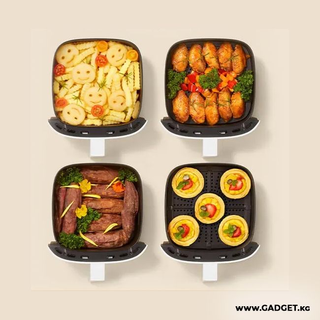 Mijia Smart Air Fryer имеет чашу большой ёмкость в которой можно приготовить за один раз на большую семью, картофель фри на 4 персоны , куриные крылышки около 10 шт, яичные тарталетки 5 шт, медовый соус 8 шт и многое другое.