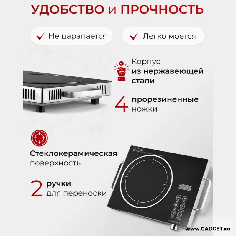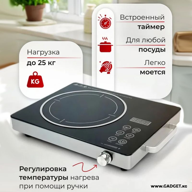 Плитку легко мыть благодаря гладкой поверхности. Встроенный таймер позволит контролировать процесс готовки без вашего участия. Плитка электрическая выдерживает нагрузку до 25 кг, поэтому подходит для использования с любой посудой – от легких кастрюлек до тяжелых сковородок.