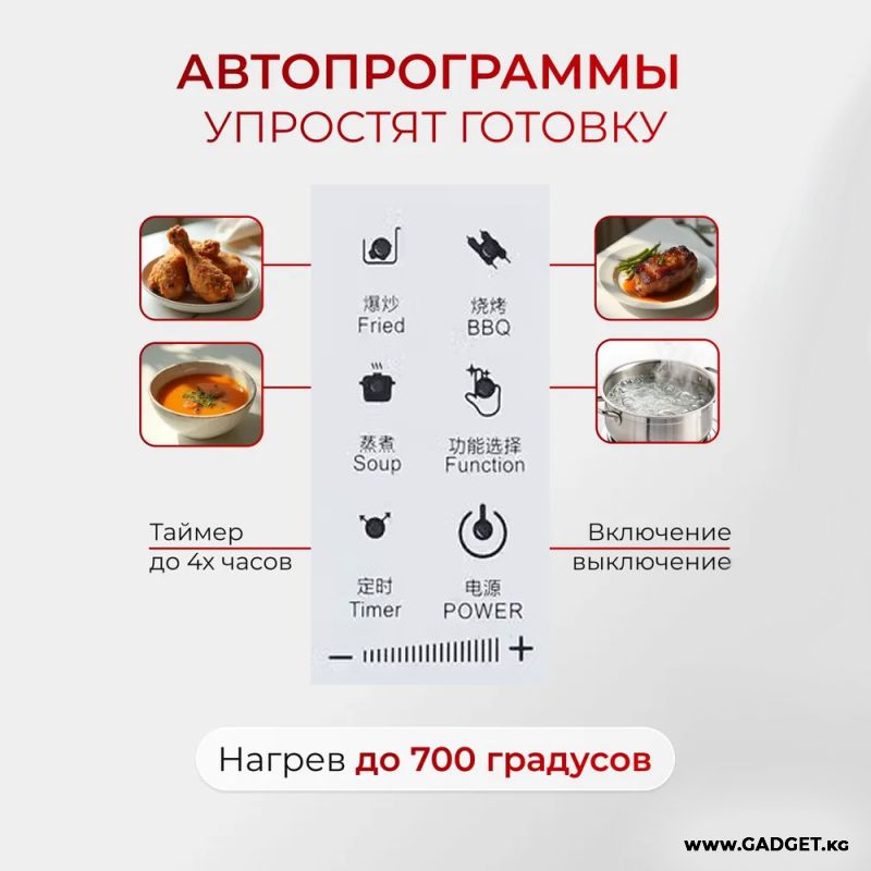 Автоматические режимы: тушение, жарка, гриль, суп. Технику можно использовать для самогоноварения исходя из веса тары при максимальной нагрузке. Плитка подходит для любой посуды с плоским дном.