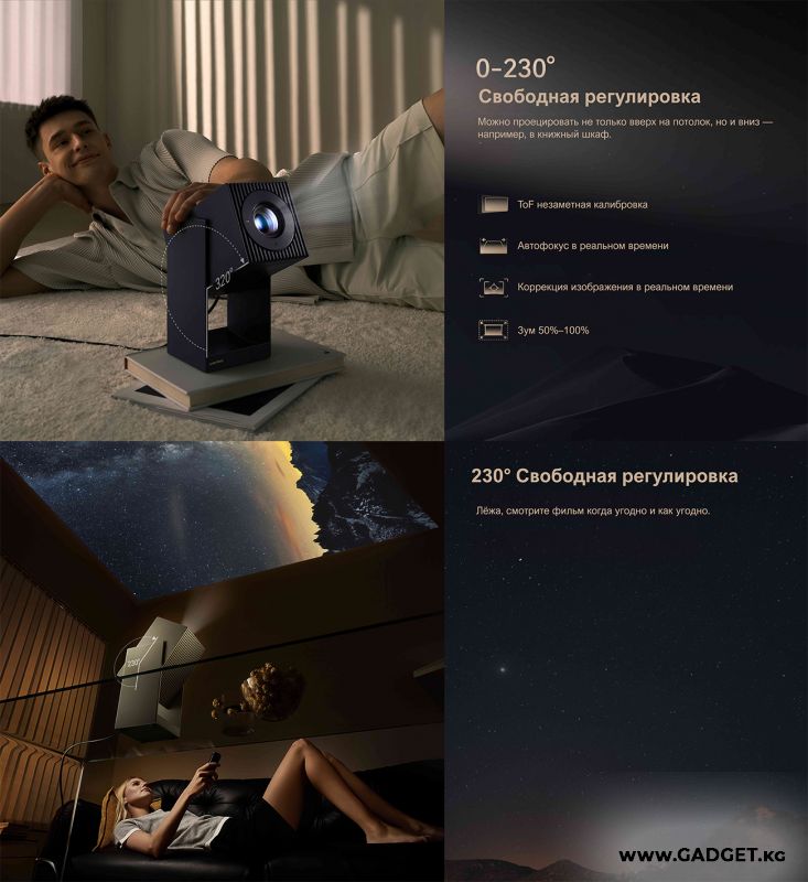 Возможности масштабирования от 50% до 100% позволяют адаптировать изображение под ваш экран или стену, а диагональ от 40 до 130 дюймов открывает широкий простор для выбора – от камерного просмотра до большого домашнего кинотеатра. Оптимальное расстояние проекции составляет 1,2-3,5 м, что делает устройство универсальным для квартир, домов и офисов. Гимбал с возможностью поворота на 230° позволяет легко направить проекцию даже на потолок, а система автоматической фокусировки и коррекции трапеции (ToF) обеспечивает ровное и четкое изображение без лишних настроек.