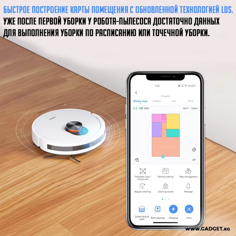 За интеллект пылесоса отвечает 4-ядердный процессор Cortex-A53. Он работает с алгоритмом SLAM, который помогает ему планировать путь, рассчитывать время уборки и эффективно очищать пространство.