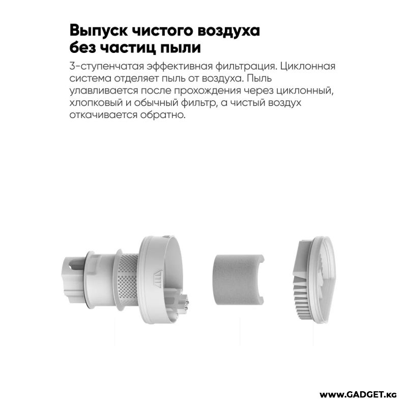 Тройная система фильтрации работает с эффективностью 99,97 %. Она включает в себя микропористый фильтр, НЕРА-фильтр и хлопковый фильтрующий элемент. Циклон отделяет пыль и мусор от воздуха.