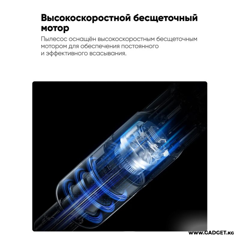 Встроенный высокоскоростной бесщеточный двигатель обеспечивает мощное всасывание 17000 Па и эффективное очищение любой поверхности.