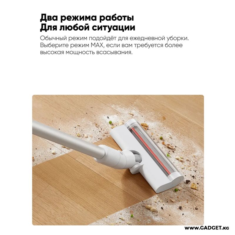 Беспроводной пылесос поддерживает 2 режима работы: стандартный и MAX. Стандартный режим подходит для регулярного очищения поверхности пола. MAX-режим поможет осуществить глубокую чистку.