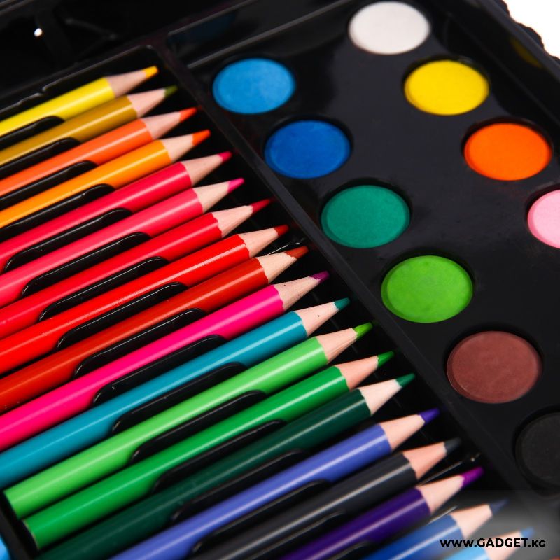 В нашем наборе есть все необходимое для занятие любимым дело, а именно 150 предметов: цветные карандаши, акварельные краски, восковые мелки, маркеры, канцелярские принадлежности и многое другое.