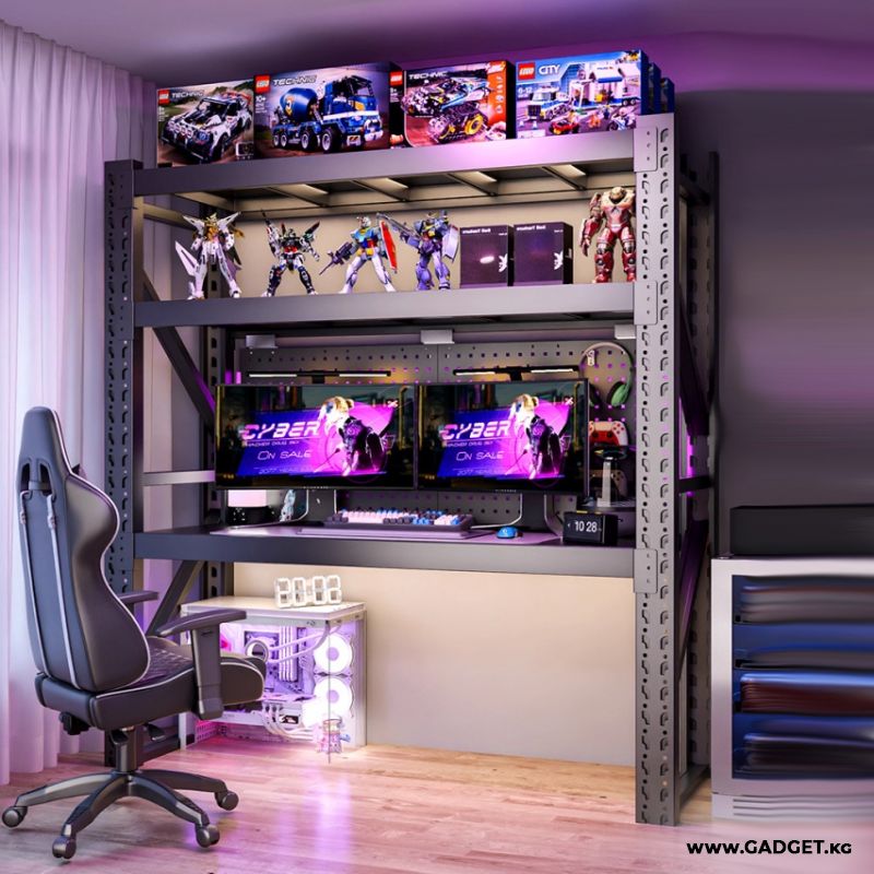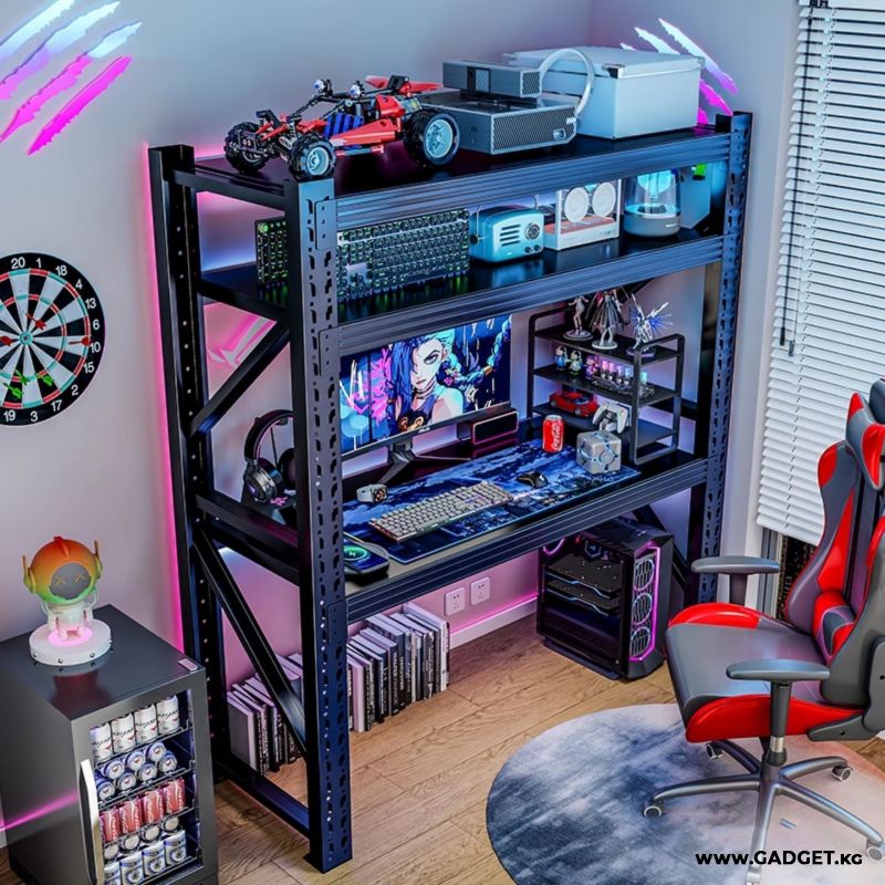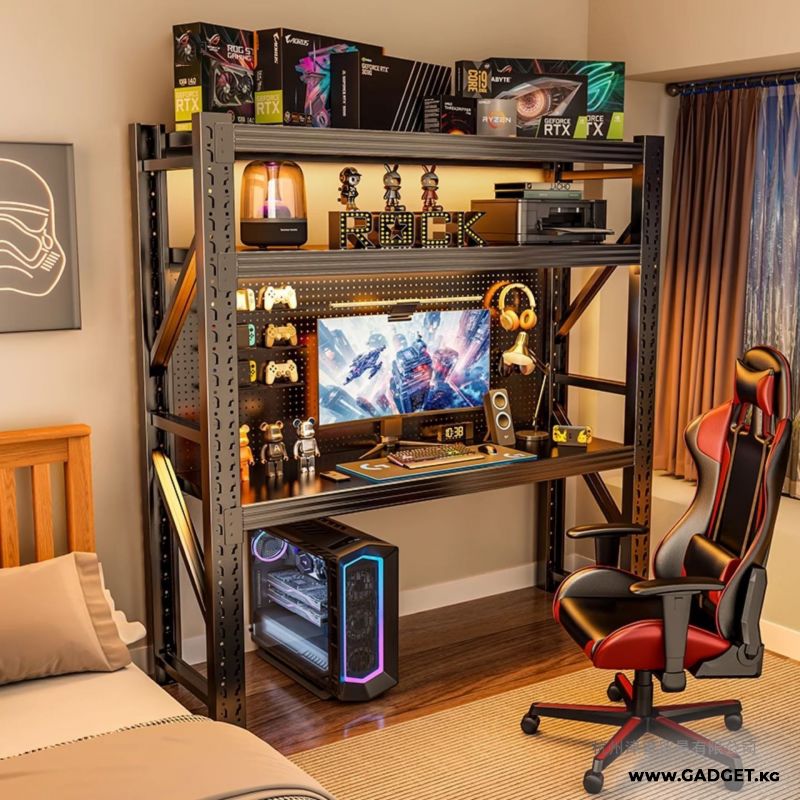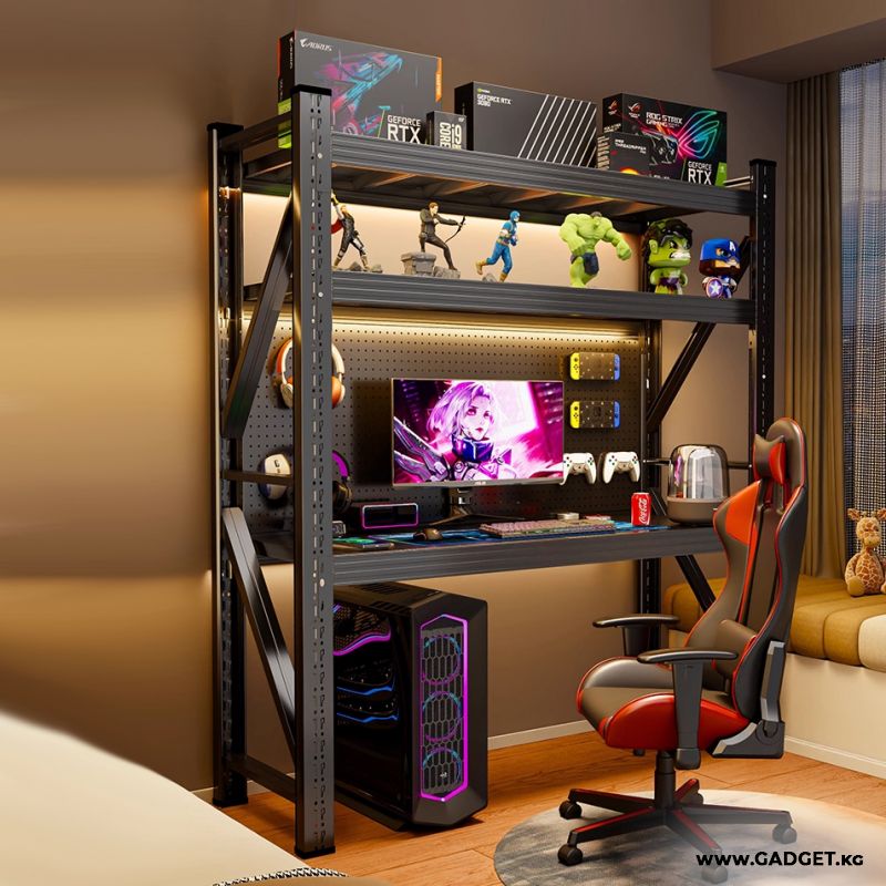 Представляем вам игровой компьютерный стол, созданный для настоящих геймеров. Этот полностью металлический сборный стол сочетает в себе прочность, функциональность и современный дизайн. Прочная стальная рама выдерживает тяжёлое игровое оборудование, а продуманная конструкция с верхними полками позволяет разместить всё — от фигурок и аксессуаров до коробок с комплектующими.