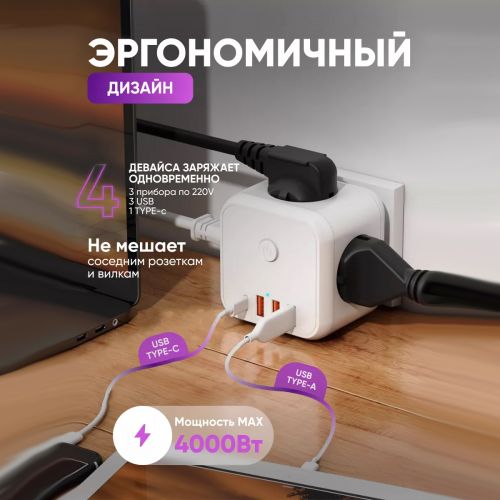 - Тройник имеет 3 стандартных разъёма для вилок и 4 дополнительных входа: 3 USB и 1 Type-C.