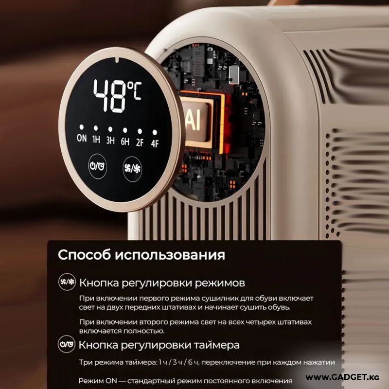 Внешне прибор похож на удобную подставку с двумя отодвигающимися держателями. Перед включением прибора, на него необходимо надеть мокрую обувь. После включения внутри сушилки начинает циркулировать теплый воздух. Воздух сильно не нагревается, так что деформация обуви исключена (что возможно, если бы вы поставили обувь на горячую батарею). Циркулирующий внутри воздух, просушивает всю поверхность и предупреждает развитие неприятного запаха.