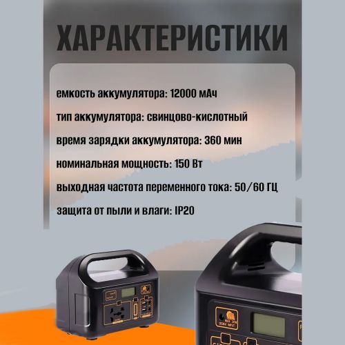 Переносная походная электростанция снабжена мощным свинцово-кислотным аккумулятором емкостью 12 000 мАч и возможностью подключать еще один дополнительный аккумулятор (разъем на задней панели). Номинальная заявленная мощность электрической станции – 150 Вт. В электростанции для кемпинга есть встроенный яркий LED фонарик, который пригодится на отдыхе, на рыбалке, в дороге.