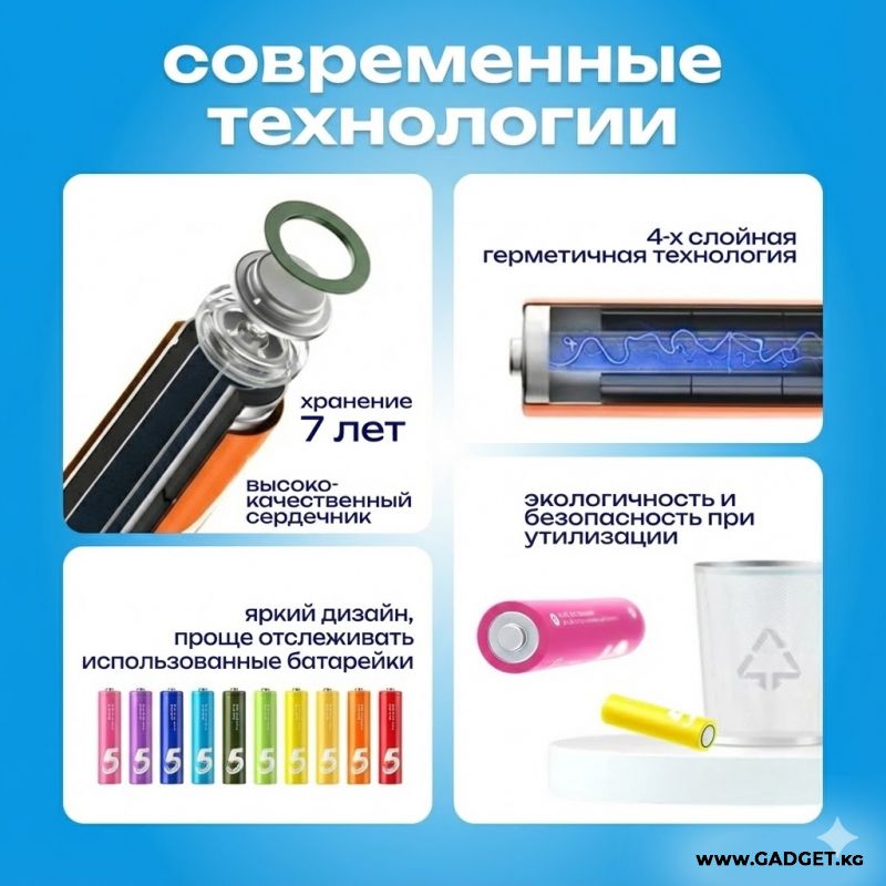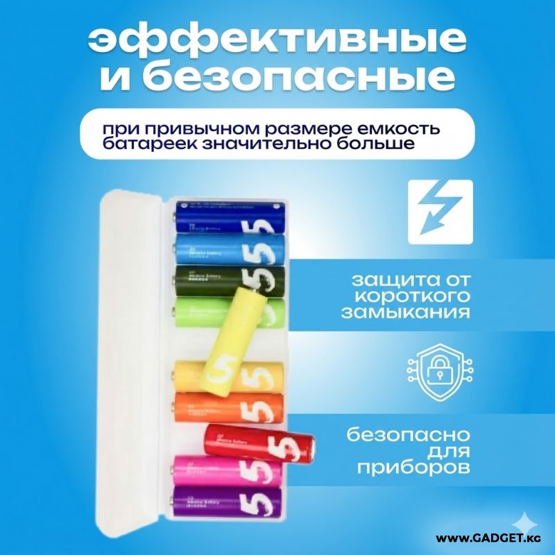 Благодаря таким технологиям использование аккумулятора стало безопасным, риск утечек, коротких замыканий сведен к минимуму. Корректной работе электронных устройств ничто не угрожает. Кроме того в составе нет ртути и кадмия. Такой подход при производстве выгодно отличает представленную модель в сравнении с конкурентами. Комплект представлен в твердом полупрозрачном кейсе футляре, батарейки яркие разноцветные, что облегчает отличие новых от уже отслуживших свой срок. Они универсальны в применении, подойдут для мышки, часов, пульта, игрушек и многого другого. Хранятся в течение 7 лет. В магазине также представлены и мизинчиковые батарейки.