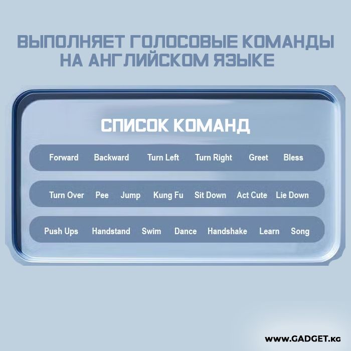 - Голосовое управление: распознаёт простые команды вроде “Sit” (сядь), “Stand up” (встань), “Play music” (играй музыку), “Dance” (танцуй), “Jump” (прыгай) и др.