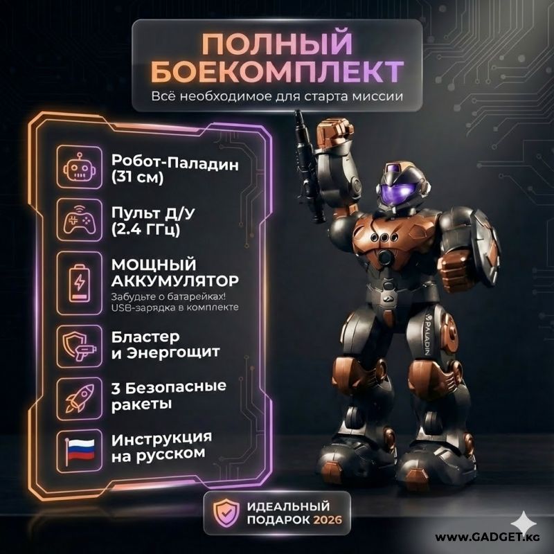 В комплекте вы найдете съемный щит и пистолет с тремя пульками, который стреляет при нажатии на рычажок, добавляя элемент игры и приключения. Кроме того, вы можете запрограммировать робота на последовательность действий, что делает каждую игру уникальной и интересной! Боевой робот, это безумно интересный и очень крутой вариант для возраста 9-10лет, а также идеальный подарок ребёнку на 4-летие.