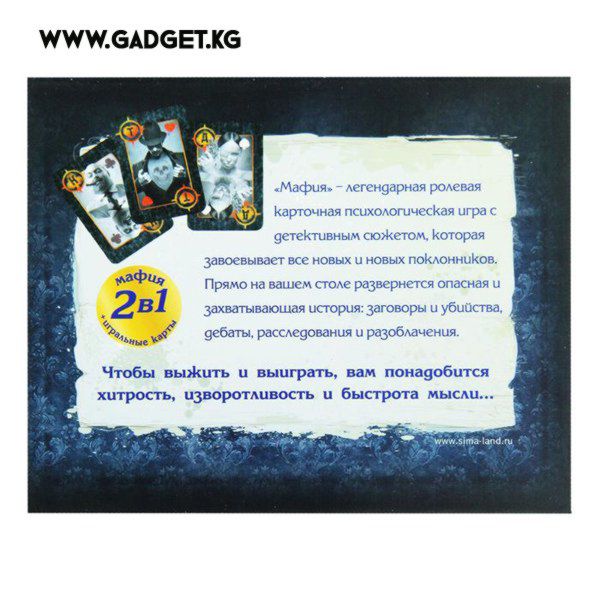 Комплект состоит из 54 карт, которые можно использовать как обычные игральные, так и для игры в мафию. Карты упакованы в эксклюзивную и стильную коробку.