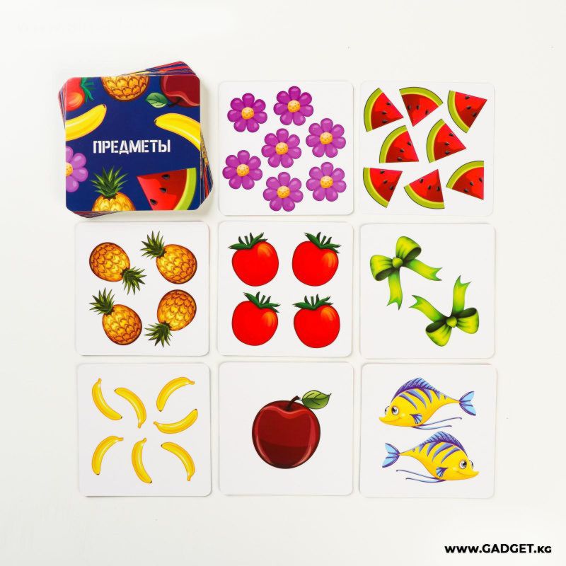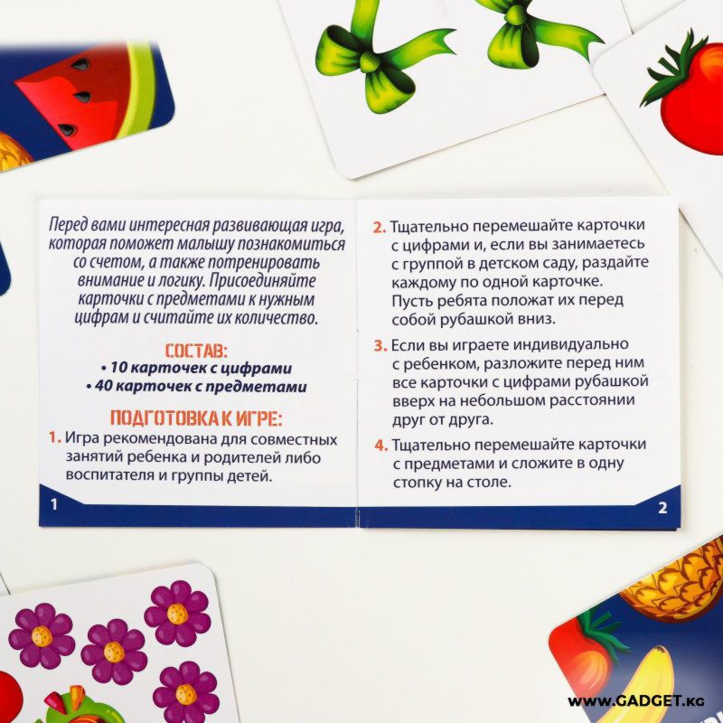 На карточках «Цифры» изображены числа и четыре вида предметов в разном количестве. На карточках «Предметы» — изображения вещей, которые дополняют карту с цифрами.