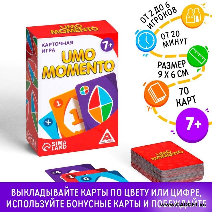 Вас ждут целых 70 увлекательных карточек! Играть очень просто: выкладывайте их по цвету или цифре. Нет подходящей? Не беда! Используйте бонусные карточки и играйте дальше. Старайтесь избавиться от всех карт как можно скорее! Кто сделает это быстрее всех, тот и становится победителем. Но не забывайте перед тем, как выложить свою последнюю карту, крикнуть громко «Уно моменто!». Иначе вас неожиданно может обогнать кто-то другой.