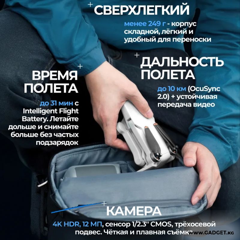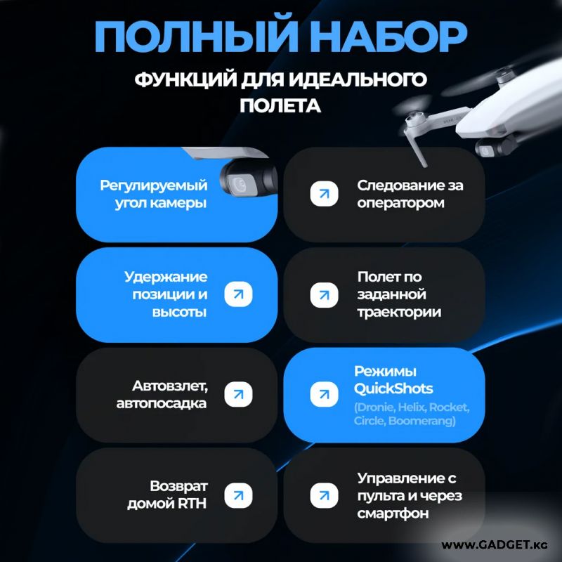 Одного заряда аккумулятора хватает до 31 минуты полёта. Это позволяет сосредоточиться на творчестве, не переживая из-за постоянных перерывов. Вы сможете тщательно спланировать маршрут, выбрать идеальный ракурс и снять именно то, что хотели.