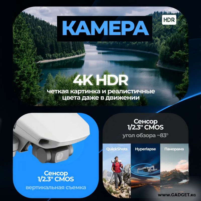 Камера DJI Mini 4K поддерживает запись в формате 4K с частотой 30 кадров в секунду. Благодаря 12-мегапиксельному сенсору и трёхосевому стабилизатору каждое видео будет плавным и детализированным. Независимо от условий съёмки вы получите профессиональный результат, который легко использовать в блогах, тревел-видео или для сохранения воспоминаний.