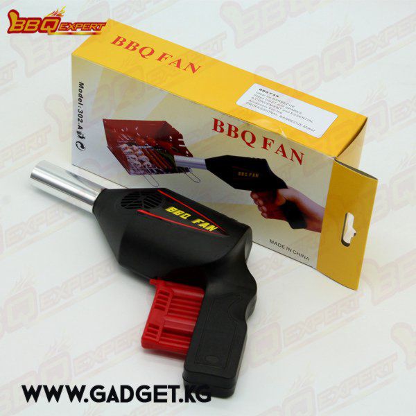 Фен для барбекю полностью механическое изделие. Нажатие на красный курок, приводит в действие внутренний механизм, который, в свою очередь, создает поток воздуха способный раздувать пламя.