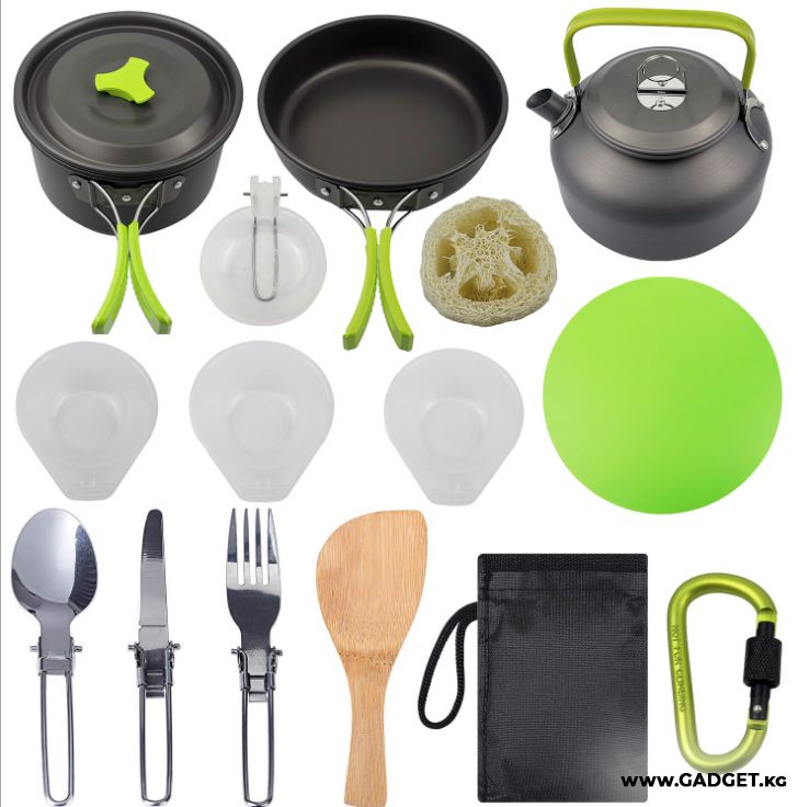 В Комплекте: Кастрюля, Сковородка, Чайник, Чашки: 3шт, Поворежка, Доска для нарезки продуктов, Ложка, Вилка, Нож, карабин