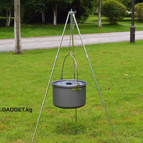 Конструкция изделия состоит из трех опор, которые соединяются на специальной круглой верхней планке. Внизу к треноге крепится цепочка, к ней с легкостью можно подвесить казанок или чайник.