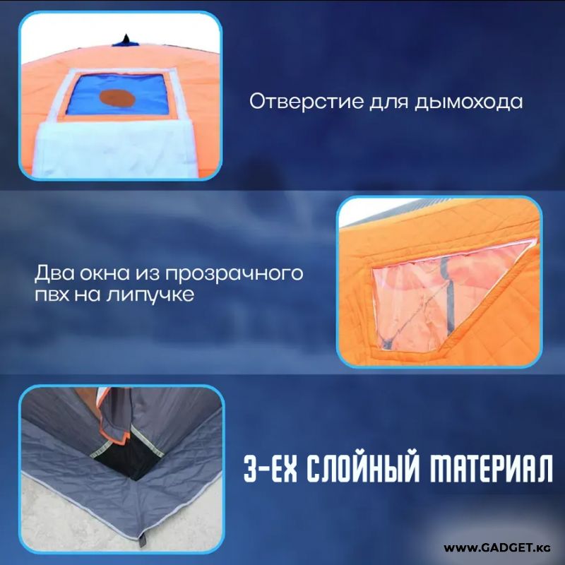 Туристическая палатка предназначена для зимней рыбалки, охоты и туризма, позволяющая Рыболову, охотнику и туристу почувствовать себя максимально комфортно на рыбалке, в лесу или горах в любых погодных условиях даже в суровую зиму.