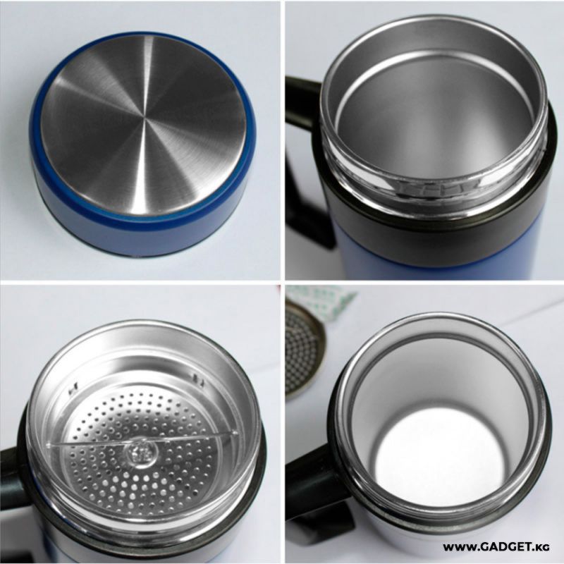 Нержавеющая сталь кружки с двойной стенкой. Не проливаемая и не протекаемая крышка, держит 2 часа тепло, около 5 часов холод.