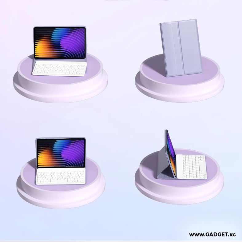 Чехол легко складывается в устойчивую подставку, обеспечивая комфортный угол наклона для набора текста, просмотра фильмов, видеозвонков или работы с документами. Конструкция фиксирует планшет надёжно и не скользит на поверхности стола.