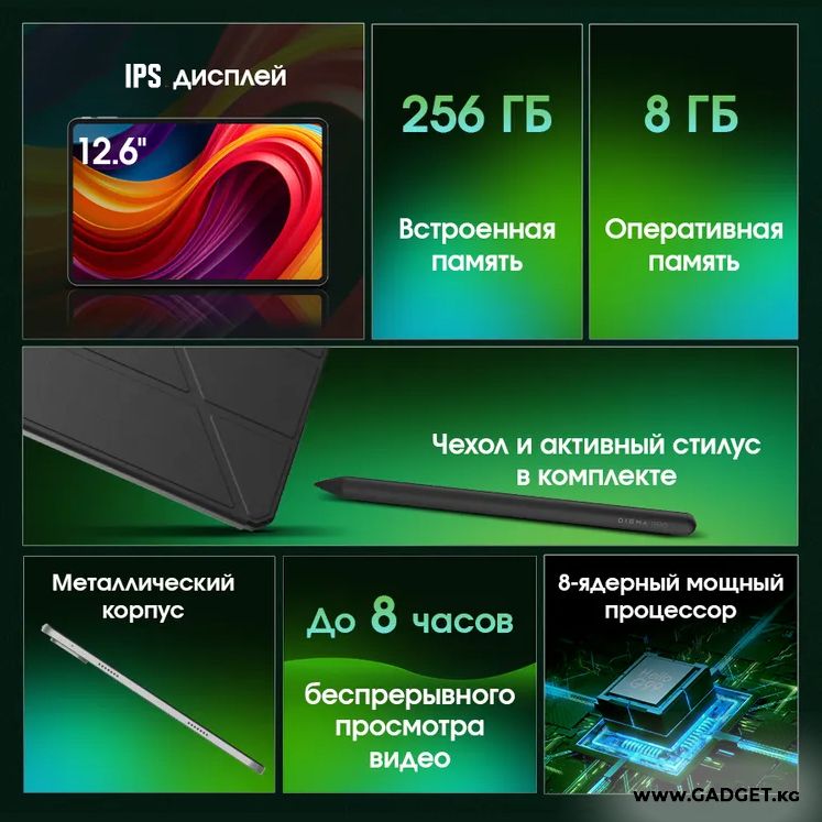 Планшет с 12,6-дюймовым IPS-дисплеем и разрешением 2560x1600 пикселей реалистично отображает детали изображения и оттенки цветов. Полезная площадь составляет 91%. Соотношение сторон 16:10 делает устройство удобным для просмотра контента и работы с документами. Экран поддерживает мультисенсорное управление и автоматическую ориентацию, что делает взаимодействие с устройством максимально удобным.