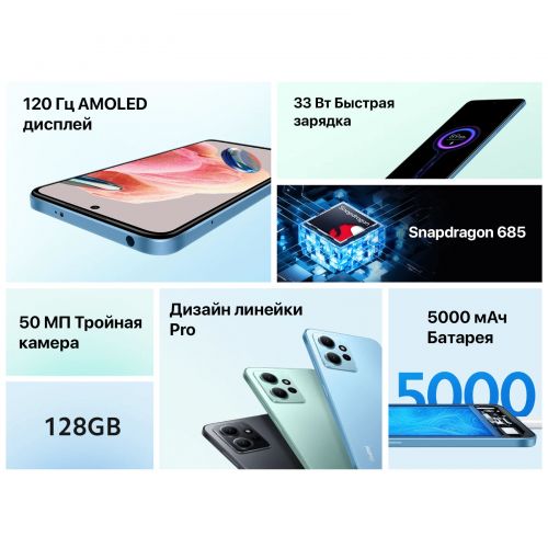 Позвольте себе больше с новым Xiaomi Redmi Note 12. Этот тонкий и элегантный смартфон открывает перед вами массу возможностей благодаря производительному 8-ядерному процессору Snapdragon 685, тройной основной камере с главным сенсором на 50 Мп, а также невероятно четкому и красочному AMOLED дисплею с разрешением FHD+ и частотой обновления 120 Гц. А чтобы ничто не отвлекало вас в течение дня, телефон получил большую батарею на 5000 мАч с поддержкой быстрой зарядки мощностью 33 Вт, которая подарит вам еще больше времени для всех ваших дел и развлечений.